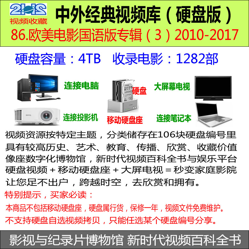 欧美电影国语版,按电影拍摄年代排序组盘,由五块4T硬盘组成,共计6260部电影